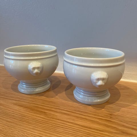 SUPPESKÅL. Fransk Løgsuppeskål med løvehoved løvehoveder løve ører håndtag