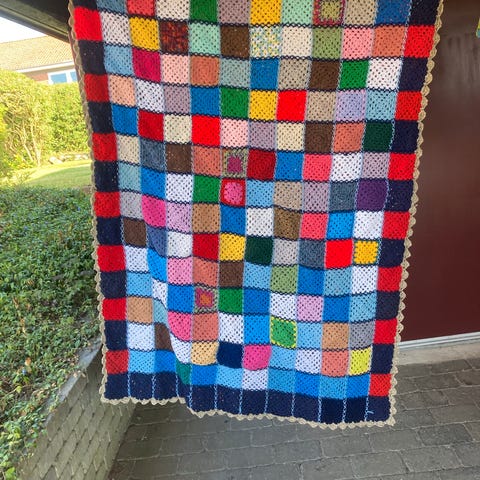 Fint og yndigt hæklet tæppe i hvidt bomuld. Måler ca. 115x175cm. Består af hæklede kvadrater med hæklet blondekant. Perfekt til børneværelset, sommerhuset, - eller i haven.