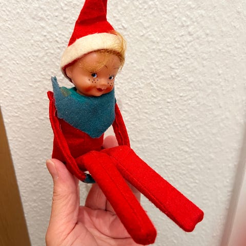 Knæ nisse, Fuld længde ca. 30,5 cm. Bøjelig ben, lidt løs arm. Sender gerne men køber betaler selv for en eventuel forsendelse.