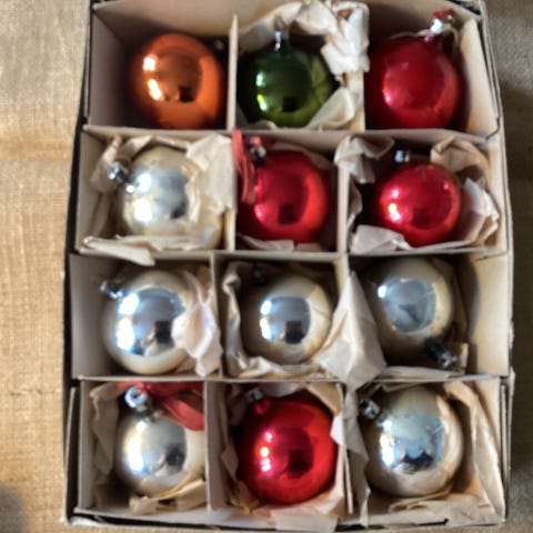 Gamle juletræskugler i form som dråber i farverne grøn, guld og rød. Alle er hele men fremstår med alderssvarende patina. Jeg sender gerne godt indpakket mod betaling af porto kr. 50.