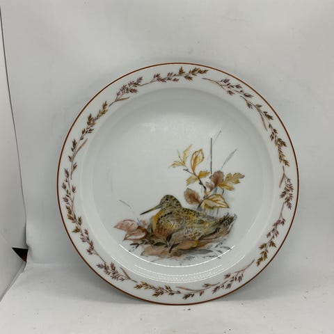 En ældre hvid fajance skål / dyb tallerken fra 60erne dekoreret med vilde ænder og guldkanter fra finske Arabia – perfekt som ymerskål, morgenmadsskål eller børnetallerken.