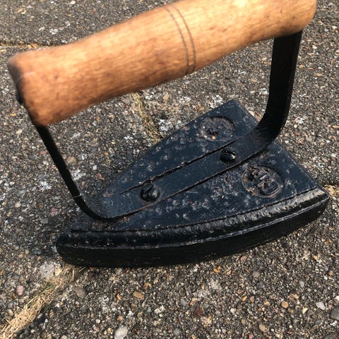 Antikke strygejern - Fr. VII, 200 år gl., To antikke stryge / pressejern! Det ene bærer inskriptionen Fr. 7 "ANK H". Dekorative i sig selv, men kan også anvendes som bogstøtter, især hvis de lægges ned med spids opad.