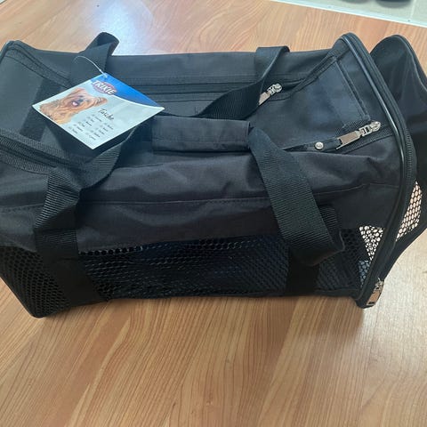 Hundetaske, Trixie, Adrina, sort med hvide kødben, kan åbnes foroven og i begge ender, foran lomme med lynlås, integreret line med karabinhage, netindsats sørger for god lufttilførelse, aftagelig skulderrem+ håndtag så den også kan bæres, i bunden lækker sort "pels" pude der kan vaskes. Nylon. 26x27x42 cm. Max 7 kg hund. MEGET VELHOLDT og HELT INDTAKT. Sælges for 135 kr. Sender gerne. Porto oveni