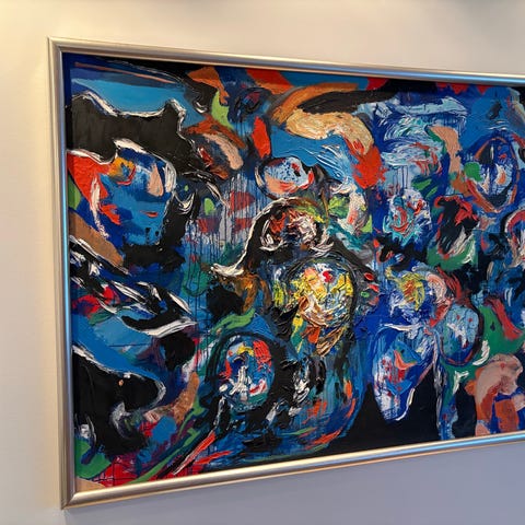 Oliemaleri, Finn Pedersen, 100 x 80 cm., motiv: Abstrakt, stil: Abstrakt, b: 80 h: 100, Originalt Finn Pedersen (f. 1944, d. 2014) oliemaleri på lærred fra 1976, "CoBrA komposition". Maleriet er signeret og dateret på forsiden. Maleriet er indrammet i ny sølv svæveramme, og det måler 100 x 80 cm. Flere Finn Pedersen malerier sælges. Kontakt mig for mere information.