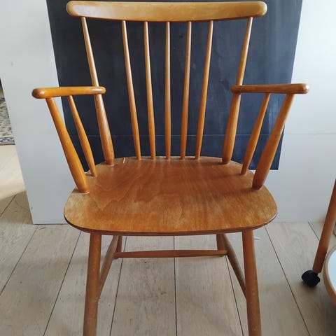 Børge Mogensen, Spisebordsstol, armstol, stol, Super flot FDB pindestol. Jeg er usikker på hvem der har designet stolen, men har tidligere set den tilskrevet Hans Wegner. Men mindre også meget om noget Børge Mogensen har udført for FDB.