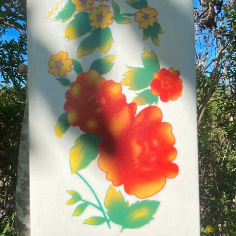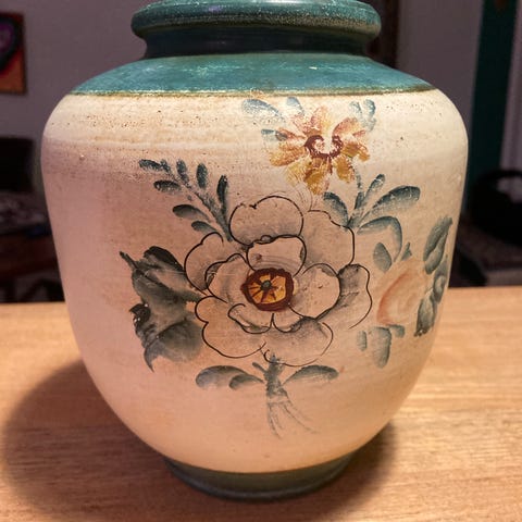 Antik dekorativ vase med blomsterdesign. Lavet af keramik med et farverigt håndmalet blomstermotiv. Vasen har en unik form med buede håndtag og en skinnende overflade. Velegnet til indretning og som et stilfuldt samlerobjekt.