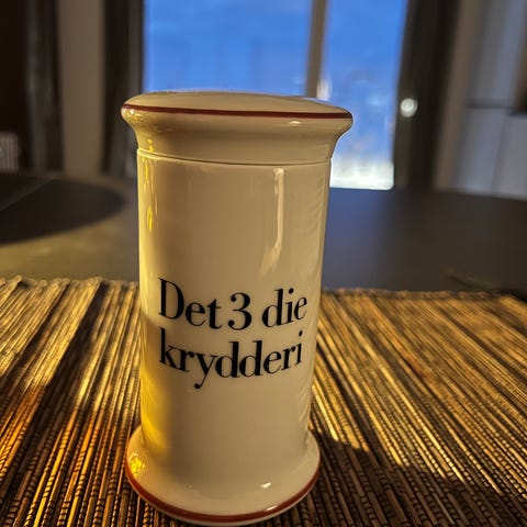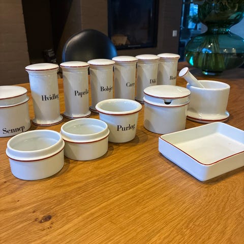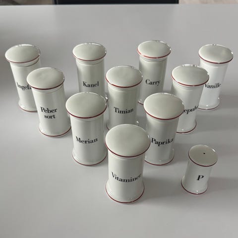 De klassiske krydderikrukker/krydderiglas fra Bing og Grøndahl. 3 stk + et ekstra låg. Kanel, salt og peber.