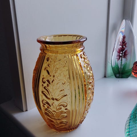 Super fin vase i presset glas, blot kaldet # 7998, her i en super flot gyldengul, en farve der er relativt sjælden for denne model, fra Holmegaard 1939