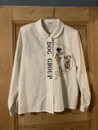 Skjorte, Japansk, str. 36, Hvid broderi, Næsten som ny, Japansk vintage skjorte med hunde broderi og teksten ‘dog group’. Lukkes med skjulte knapper foran og har guldknapper på ærmerne. Der er en ekstra knap med i vaskemærket.
