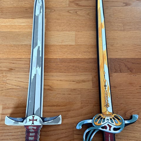 Sejt lyserødt matchende prinsesse sværd og skjold. Det kan ses det er brugt, men de ret stadig masser af lege værdi i det. Kommer fra røgfrit hjem.