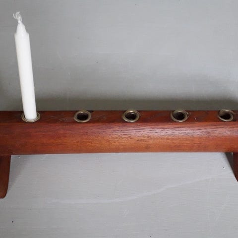 Lysestage, Flot retro stage i teak og forsølvet metal. God stand. Passer til små ‘juletræslys’. Måler ca. L17cm B7cm H 12cm/8cm