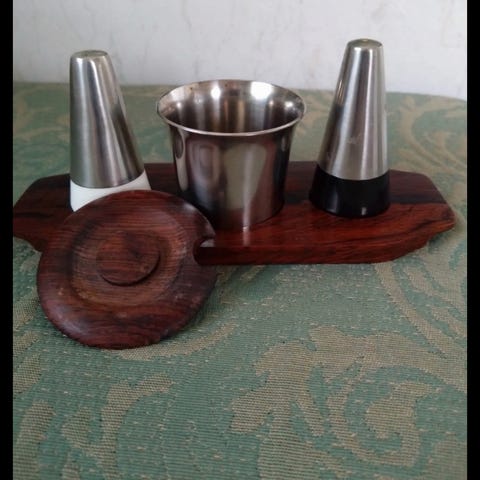 Andet, Salt, peber, sennep, Lundtofte, Saltbøsse, peberbøsse og sennepskrukke med låg i palisander. Står på en bakke i palisander.
