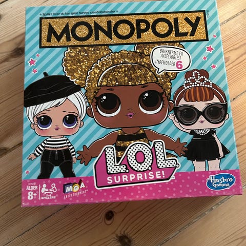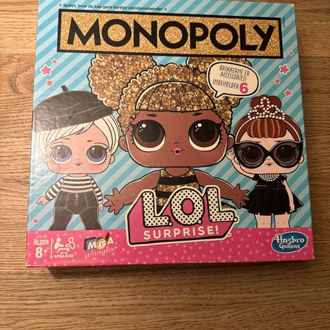 Monopoly i en særlig L.O.L SURPRISE! udgave, hvor det handler om at købe, sælge og bytte de sjove dukker fra L.O.L. SURPRISE! i stedet for grunde og ejendomme. Målet er at samle de sjældne dukker. Spillets dele er tilpasset L.O.L SURPRISE! temaet - Surprise!-kort erstatter chancekortene, stjerner og emojis erstatter huse og hoteller, og brikkerne er flotte accessories fra L.O.L.-dukkerne.