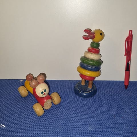 Hund i træ, der kan samles og skilles ad. Har kun stået til pynt.