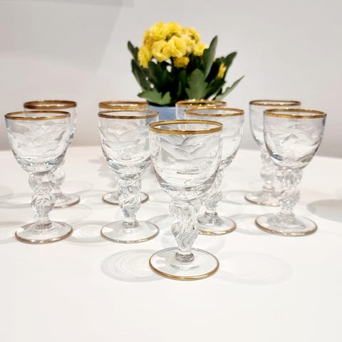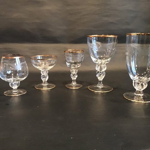 Alle glas er i perfekt stand, guldkanterne er intakte og glasmassen er klar og skinnende.