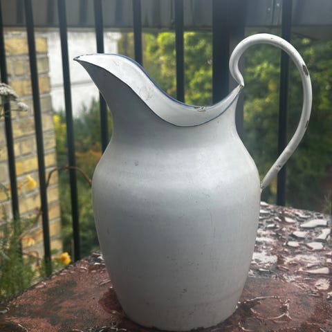 Emalje kande, Emalje kande med hank og tud. Den kan stå og hænge. Flot med blomster i , den har et lille hul i bunden. Made in Belgium til 2 L. Vintage af ældre dato. Højde 24 cm. Diameter 13,5 cm. Pris 200 kr. Se også mine andre annoncer. Hv123