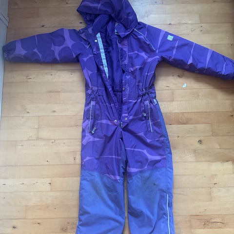 Dragten har 2 lynlåslommer, hætte, div. reflekser og velcro på ærmerne til fastgørelse af handsker. Stropperne under foden er intakt.