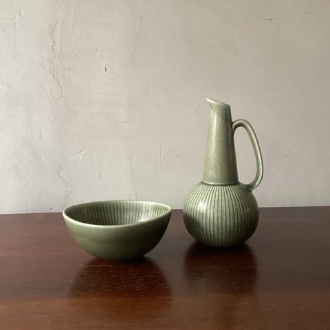 Fin og lækker keramik kande i mat grøn glasur fra Ritzi serien, Rörstrand, formgivet af Gunnar Nylund. Kanden fremstår i flot og hel stand. Jeg sender gerne godt indpakket mod betaling af porto kr. 50.