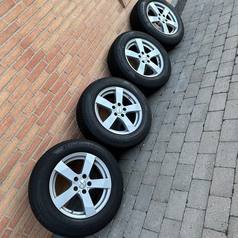 To af dækkene skal skifte da de ved og være slidte og to af dækkene er fine og kan sagtens køre en sæson nu. Fælgene er også i god stand.