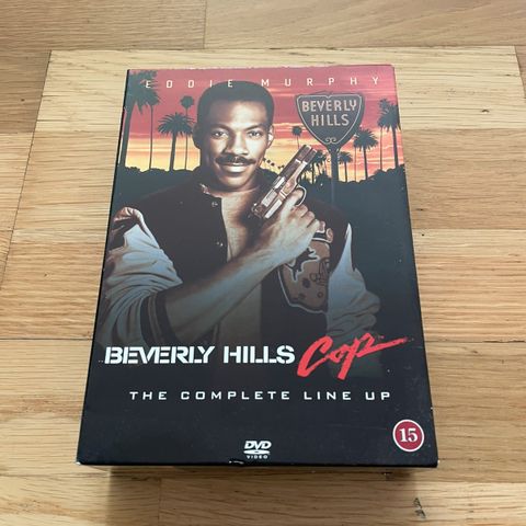 Boks med alle tre film i "Frækkere End Politiet Tillader" serien med Eddie Murphy i rollen som Axel Foley - politimanden fra Detroit på forbryderjagt i det fashionable Beverly Hills.