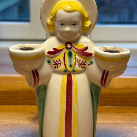 Engel med lysestage - er sammen med 2 andre englefigurer tegnet af Nils Thorsen i 1943.