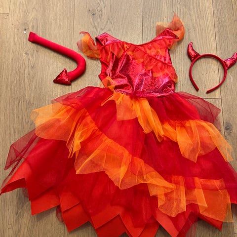 Udklædningstøj, Djævle kostume, Temashop, str. 68, Fint djævle kostume/udklædning til baby til haloween og fastelavn med hue og kappe i str 0-6 måneder. Brugt en gang og fremstår som nyt.