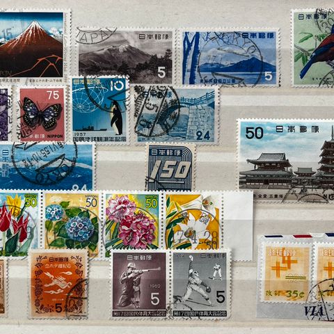 Asien, stemplet, Frimærke fra Japan ( Nippon ), 28 forskellige stemplede japanske frimærker, 1 stribe med 3 ens frimærker og 11 dubletter.
