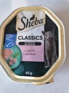 Foto 1 og 2: Sheba vådfoder 25stk a 85g med laks smag Holdbar 28 maj 2026.