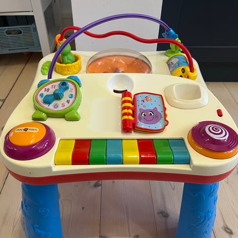 Andet, Legebord, 1 stk brugt legebord på hjul, med rund topplade, bordet er godt solidt og med plads til evt kurve på hylder, bordet har skrammer, mærker, ridser og trænger til rengøring. Ø:95cm. H:52cm. Bordet er ikke nyt og sælges derfor som brugt, derfor kan der forekomme ridser, slid og skrammer. Prisen er kun 450kr.