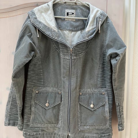 Jakken har et unikt mønster i grå og blå nuancer og er designet med en klassisk krave og knaplukning.