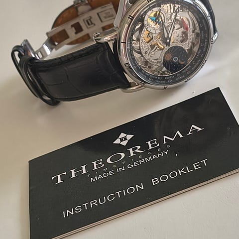 Unikt og sjældent udbudt ur fra tyske Theorema. Er du nysgerrig på alle detaljerne så følg mit link længere nede, det er et besøg værd.