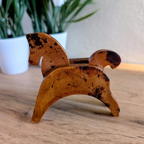 Hesten har små tynde ben, kroppen og hoved, er to stykker træ der er cylinder formet. Øjne er påsatte klistermærker.