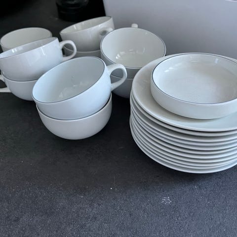 Porcelæn, Tallerkner og kopper, Royal Copenhagen, Hvidt stel med smal guldkant. Der er skår på noget af det - se billeder.