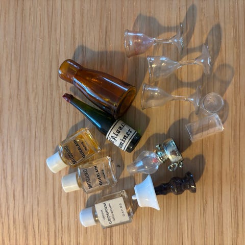 Små hjemmelavede flakoner til dukkehus/barbiedukker, lavet af perler.