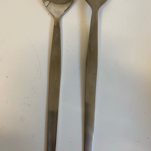 Holmegaard salatbestik i rustfrit stål. Bestikket består af to dele designet til servering af salat. Materialet sikrer holdbarhed og nem rengøring. Fejler intet - har været pakket ud og lagt i en skuffe.