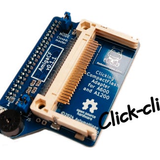 Med AmigaCF kan man sætte et CompactFlash-kort i sin Amiga 600 eller Amiga 1200 i stedet for en normal harddisk. Adapteren laver "klik-lyde" ved aktivitet for at emulere en gammeldags roterende harddisk. Den sidder solidt direkte på Amigaens IDE-stik på bundkortet uden brug af kabler og andet, der får den til at "rasle" rundt.