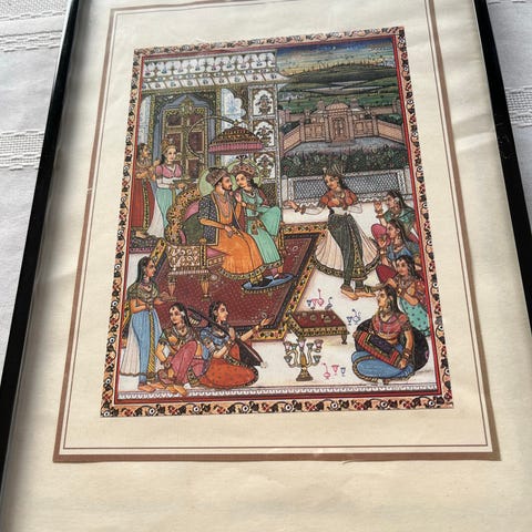 Miniaturemaleri fra Indien malet med gouache på silke. Det er sandsynligvis udført i 1980'erne. Motivet stammer fra manuskriptet Baburnama og forestiller en scene fra 1498, hvor stormogul Babur er syg og bliver tilset af læger. Indrammet i teaktræsramme med passepartout. Lysmål: 19 x 28 cm. Mål med ramme: 32,5 x 47 cm. Fremstår i pæn stand.