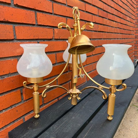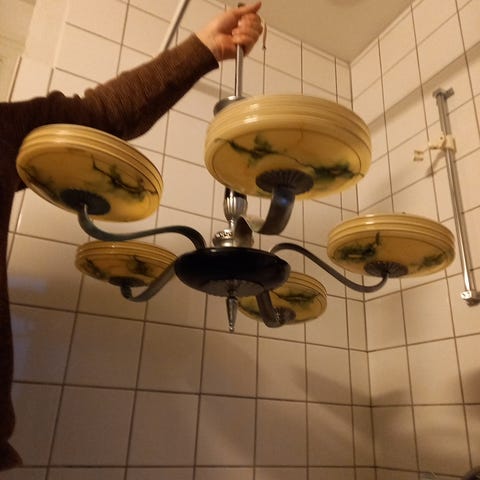 Lysekrone, Art deco, Flot stor art deco lysekrone med marmoreret glas og stål. Lidt patina på selve stellet, ingen skader på glasset. Generelt i flot stand.