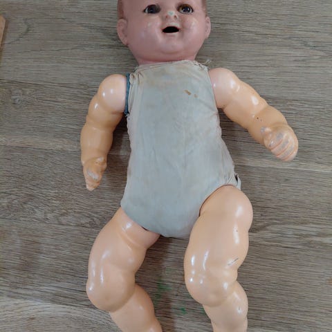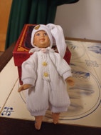 Den lille pige har en fin hvid heldragt på og lang nat hue. Har bare fødder. Mange flotte detaljer. Meget naturtro med charmerende ansigt.
