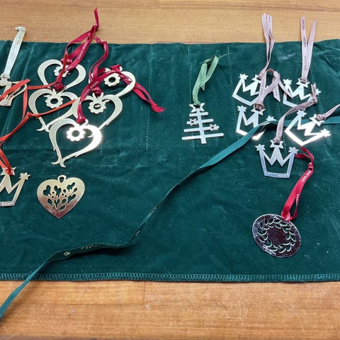 Fineste Georg Jensen Golden Christmas juleornamenter til ophængning på juletræ. Guldbelagt. 7 forskellige motiver. Æblet mangler desværre en kæde, men kan nemt erstattes af en guldsnor. Fremstår i øvrigt i flot stand. Pris pr stk 125kr, æblet 100kr. Samlet pris 800kr. Spørg vedr. fragt, da det afhænger af antal.