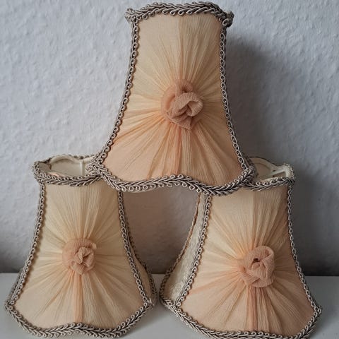 Vintage lampeskærme sæt i sart gult stof med dekorative detaljer. Velegnet til små bordlamper eller væglamper. Klassisk design med en blød, varm farve, der passer til forskellige indretningsstile. Målene er ; 11 cm høje og diameter for oven 6 cm og forneden 11 cm