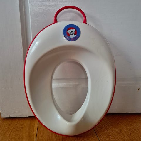 Toiletsæde, BabyBjørn, BabyBjørn toiletsæde, der placeres på toilettet. Vingerne på undersiden skrues til, så de er spændt mod toilettets sæde. Sidder fast og sikkert. Meget lidt brugt - kun hos bedsteforældre. Fra røgfrit hjem uden dyr. Pris for ny: kr. 300.