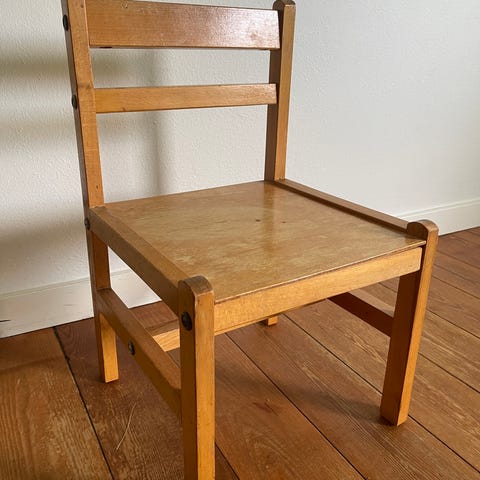 Stol, Ukendt, Charmerende gammel børnestol, med navnet KURT indgraveret i rygstykket. Original maling. Ok stabil, selv om et af benene har fået en støtteanordning. Sædehøjden er 30cm. Også fin i udstillingsvindue.- og den er nok svær at sende. #børnestol #retrostol #udstillingsobjekt #kurt