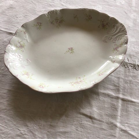 Fajance, Fad uden kuppel, 236 H. RD No 546332, Smuk gl. Romantisk fajance fad i den smukkeste creme farve med glas kuppel.