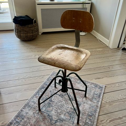 Andet, Høj arbejdsstol, med et industrielt look, tidligere brugt på systue., Nu ombetrukket med lys læder. Er på rulleben og med hæve/sænkefunktion.