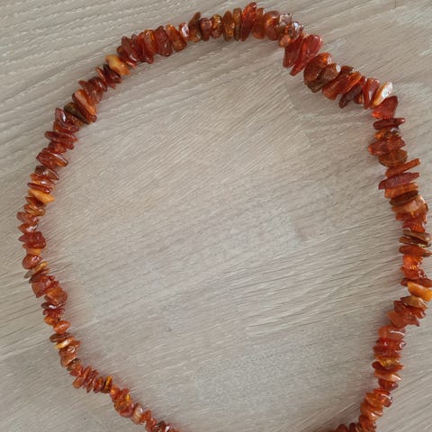 Meget smuk og lang ravkæde i mørkebrune nuancer. De polerede stykker er i forløb fra 2 til 1 cm.