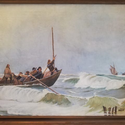 Oliemaleri, Ejgil Jacobsen, b: 37 h: 35, Fiskerbåde på oprørt hav. Olie på plade, signeret J.E.J.. I god stand med pæn gl. ramme. Rammemål 46x44. Evt. forsendelse.