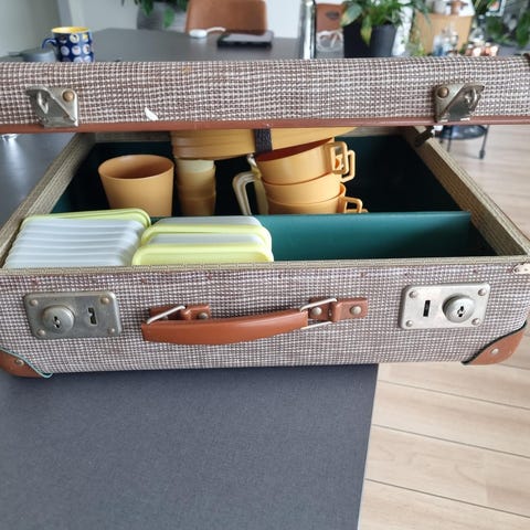 Picnic kuffert, Gammel retro picnic kuffert med praktisk indretning og fine detaljer som fx hjørnebeskyttelse i metalbeslag.