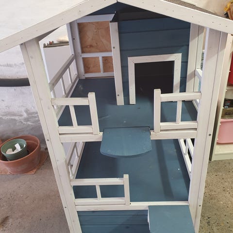 Kattehus MJ :UDE Kattehus er din kat /katte ude vil de gerne have et hus de kan gå ind i når det er dårligt vejr eller vil have fred taget kan tages af under rengøring uden værktøj Måler ca.l 53 b 33 h 40 cm der er plads til en 2 cm flamigoplade under huset som kuldebro kan købes med for 40 kr.er bygget af genbrug og rester fra tømmer arbejde tagpap og flamingo er nyt et fint hus SE PRISEN KUN .hus uden paptag 300 kr med paptag + 60kr ialt KUN 360 kr. + flamingo 40 kr afhentet (( fragt GLS 110 kr. ) HUSET ER SAMLET