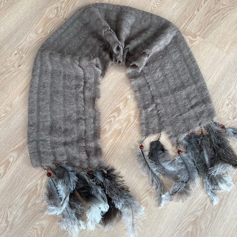 Helt nyt lækkert tørklæde i en varm brun farve med fjer. Du er velkommen til at hente jeg kan også sende hvis du betaler porto jeg sletter annoncen når tørklædet er solgt